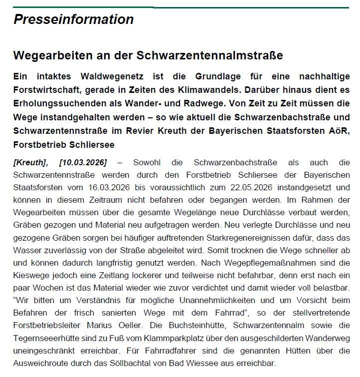 Die Bayerischen Staatsforsten erneuern sowohl die Schwarzenbachstraße als auch die Schwarzentennstraße. Die Zufahrt zur Schwarzentennalm und angrenzende Bereiche von der Kreuther Klamm aus ist derzeit nicht möglich. Radlfahren nur über Bad-Wiessee möglich.